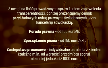Kancelaria Adwokacka świadczy usługi prawne na rzecz klientów indywidualnych, osób prawnych, stowarzyszeń oraz fundacji.